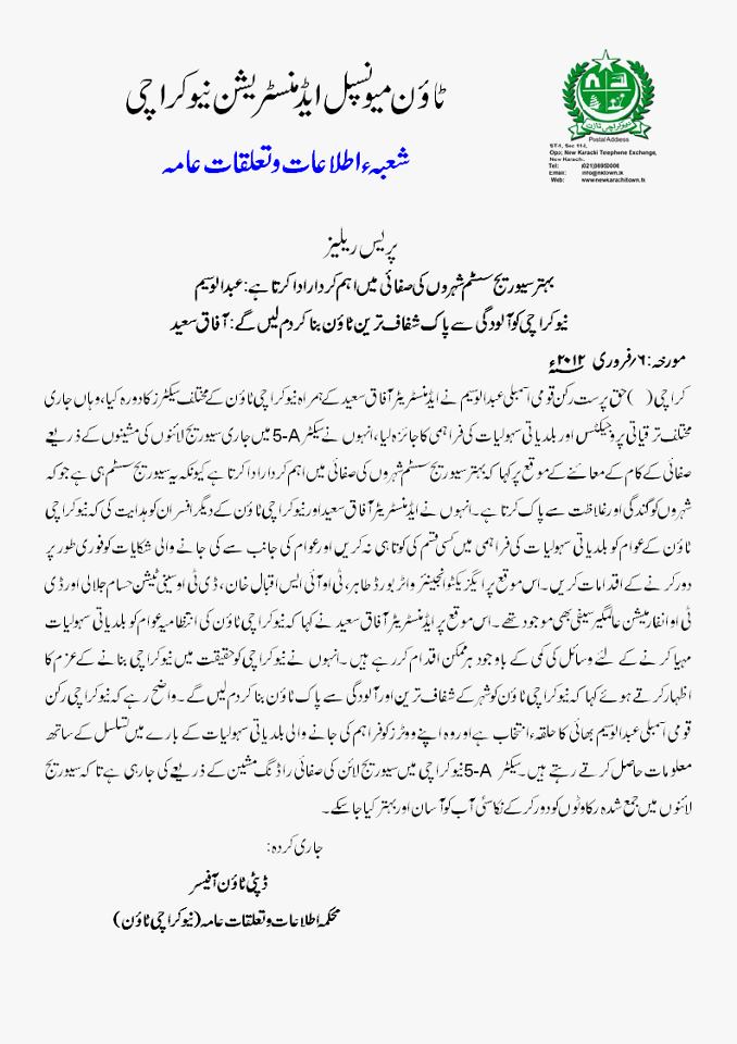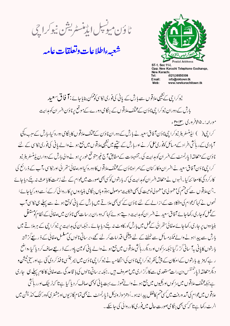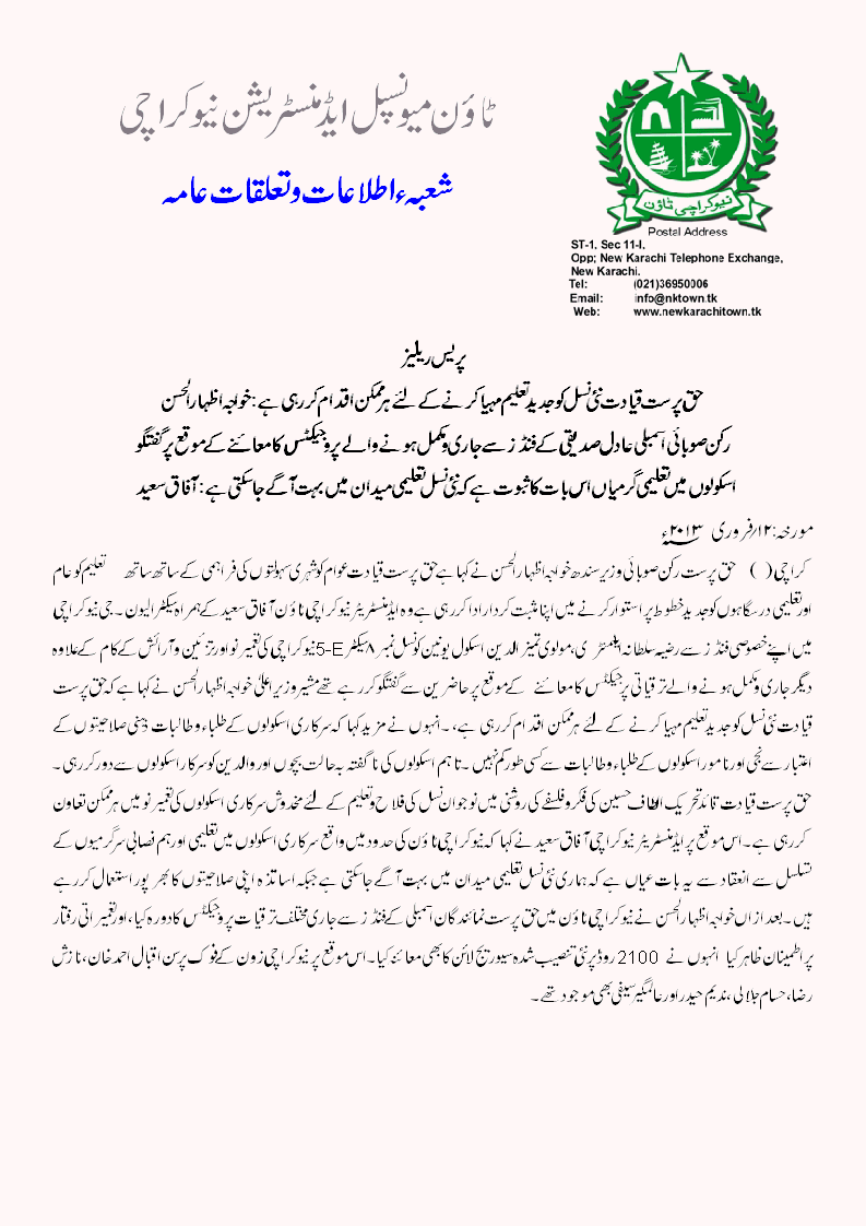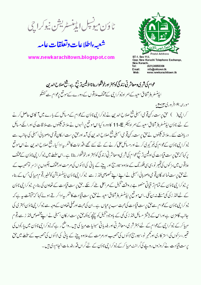 کراچی ( ) ٹاؤن کی تعمیر و ترقی و خوشحالی کے لئے کوشاں ہیں ان خیالات کا اظہار حق پرست رکن صوبائی اسمبلی جمال احمد نے ایڈمنسٹریٹر نیو کراچی ٹاؤن آفاق سعید کے ہمراہ نارتھ کراچی 3000 روڈ پر انڈا موڑ سے محمد شاہ قبرستان تک برساتی نالے کی تعمیر کے کام کا معائنہ کرتے ہوئے کیا اس موقع پر ،(ٹی او آئی ایس) اقبال احمد،(ڈی ٹی او پارک )اکبر حسین ، (ایم وی آئی) ندیم حیدر،اور ڈی ٹی او انفارمیشن ابو ظفر بھی انکے ہمراہ موجود تھے۔ رکن صوبائی اسمبلی نے موقع پر موجود افسران کو ہدایت کی کہ شہر قائد میں جاری ترقیاتی کاموں کو بروقت مکمل کیا جائے ۔اس موقع پر ایڈمنسٹریٹر نیو کراچی ٹاؤن آفاق سعید نے کہا کہ علاقے میں برساتی نالے کی تعمیر سے علاقے میں برساتی پانی کی نکاسی میں مدد ملے گی اور عوام کی پریشانیوں میں کمی واقع ہو گی انہوں نے مزید کہا کہ وہ اور ان کی پوری ٹیم حق پرست رکن صوبائی سمبلی کے تعاون سے ٹاؤن کی تعمیر و ترقی کے لئے اپنا بھر پور کردار ادا کررہی ہے۔