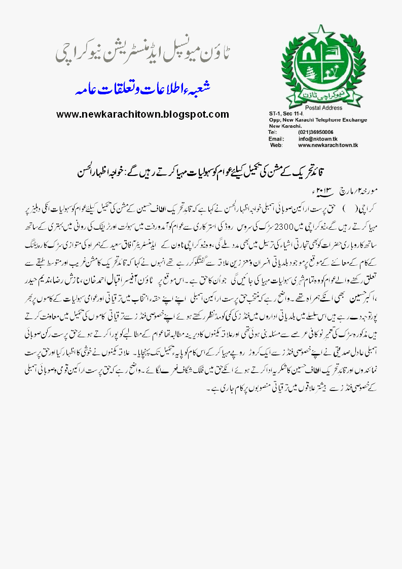 کراچی ( ) قائد تحریک جناب الطاف حسین کی ہدایت پر حق پرست قیادت شہریوں کو تمام تر بنیادی سہولیات انکی دہلیز تک پہنچانے کیلئے اپنے تمام تر دستیاب وسائل کو بروے کار لا رہی ہیں ٹاون میں جاری مختلف ترقیاتی منصوبے تکمیل کے مراحل میں ہیں ان خیالات کا اظہار حق پرست رکن قومی اسمبلی شیخ صلا ح الدین نے ایڈمنسٹریٹر آفاق سعید کے ہمراہ نیو کراچی ٹاون سیکٹر الیون ٓائی میں تعمیر ہونے والے سلا ئڈنگ فیملی پارک کے معا ئنے کے موقع پر کہی انہوں نے کہا کہ سلائڈنگ و فیملی پارک کی تعمیر سے اہلیان نیوکراچی و نارتھ کراچی کی عوام کو سستی تفریح میسر آئیگی جب کہ پارکوں سے ٹاون کی سر سبز و شادابی میں بھی اضافہ ہو گا انہوں نے موقع پر موجود افسران کو ہدایت کی کہ پارک کی تعمیر کو جلد از جلد مکمل کرلیں اور جاری ترقیاتی منصوبوں میں کسی بھی قسم کی تاخیر برداشت نہیں کی جائے گی اس موقع پر ایڈ منسٹریٹر نیو کراچی آفاق سعید نے کہا کہ حق پرست قیادت کے تعاون سے ٹاون کو سر سبز و شاداب بنانے کیلئے ٹاون انتظا میہ مصروف عمل ہے انہوں نے کہا کہ ٹاون میں مختلف پارکوں میں سلائڈنگ و فیملی پارک ایک خوشگوار اضافہ ثابت ہوگا اس موقع پر ٹی او(آئی۔اس) اقبال خاں ، ڈی ٹی او پارک اکبر حسین، ڈی ٹی او انفار میشن ابو ظفر ، ڈی ٹی او ( بی اینڈ ار) نازش رضا زیدی و دیگر افسران بھی موجود تھے