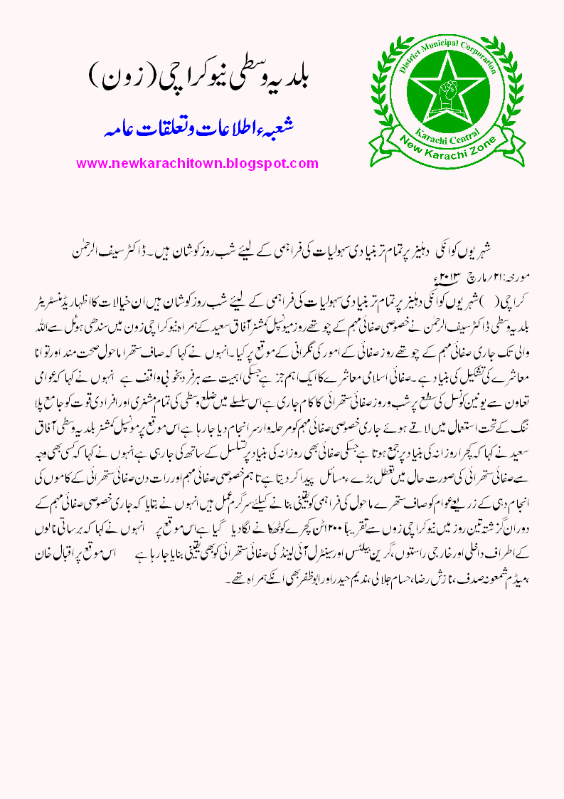 DMC New Karachi Zone is one of the biggest Zone of the Karachi. It has 13 No. of union councils. It is a very sensitive, thickly populated town population is (1,000,000) approximately (6.84.173 according to 1998 census) and having a very diverse social set-ups. E-mail:info@nktown.tk Website: www.newkarachitown.tk